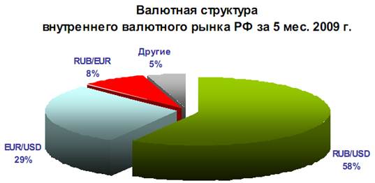 Таким образом, в первом полугодии 2009 года внутренний валютный рынок оставался одним из наиболее значимых сегментов российского финансового рынка. Ценовые и объемные индикаторы, характеризующие конъюнктуру рынка, в анализируемый период отличались высокой волатильностью. После серьезного ухудшения в конце 2008 года и начале 2009 года в условиях мирового финансово-экономического кризиса, ситуация на внутреннем валютном рынке стала постепенно стабилизироваться. Его участники адаптировались к изменениям рыночной конъюнктуры. Инфраструктура биржевого и внебиржевого сегментов внутреннего валютного рынка сохраняла свою работоспособность в полном объеме.