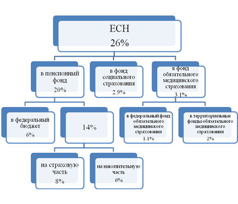 С 1января 2010г работодатели вместо единого социального налога уплачивают страховые взносы в государственные внебюджетные фонды: в Пенсионный фонд РФ, Федеральные фонды социального страхования и обязательного медицинского страхования. В 2010г разбивка 20% взносов в Пенсионный фонд РФ изменилась и составляет: на финансирование страховой части для лиц 1966г рождения и старше уплачивается вся сумма взносов – 20%, а у лиц 1967г рождения и моложе страховая часть составляет 14%, а накопительная – 6%.