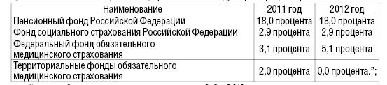 Для указанных лиц на 2011 год устанавливается пониженный тариф страховых взносов в ПФР – 18% (общий тариф – 26%). В остальные фонды размеры страховых взносов составят: в ФСС РФ - 2,9%, ФФОМС - 3,1%, ТФОМС - 2,0%. В 2012 году размеры тарифов сохранятся. При этом взносы в Фонд обязательного медицинского страхования с 2012 года будут уплачиваться только в ФФОМС[9].