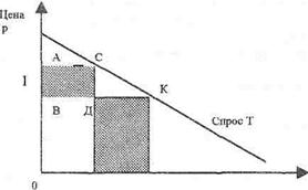 На графике показана зависимость между применяемыми ценами, выручкой и потребительским спросом. Прямая Т характеризует изменение спроса в зависимости от уровня цен. Зависимость обратно пропорциональная, т.е. чем выше уровень цен, тем ниже спрос, и наоборот. Графически весь объем планируемой выручки заключен в четырехугольник ВОМК. Если увеличить цены на выпускаемую продукцию, то увеличится выручка на величину, эквивалентную четырехугольнику АВСД, но одновременно уменьшится на величину, соответствующую четырехугольнику.