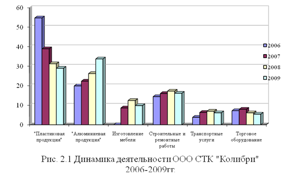 При этом в последнее время имеет место увеличение удельного веса «алюминиевой продукции», шлагбаумов, мозаик, рольставен в общем объеме выручки на фоне заметного снижения объемов продажи пластиковых окон, стеклопакетов, дверей и других конструкций. Как видно из таблицы, остальные виды деятельности имеют меньший удельный вес в общем объеме выручки. Более наглядно динамика деятельности ООО СТК «Колибри» видна на рисунке 2.1