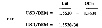 На валютном рынке банки котируют валютные курсы с использованием двух сторон — bid и offer. Если посмотреть на котировку курсов в газетах, в обменном пункте или на мониторе Рейтера, можно увидеть такое написание:
