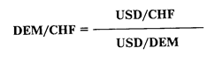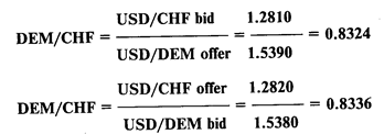 Если USD/CHF = 1.2810, а USD/DEM = 1.5350, то кросс-курс DEM/CHF составит 1.2810/1.5350 = 0.8345 с округлением до пункта.