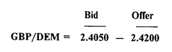 Данные способы применяются для расчета среднего кросс-курса, однако в реальности любые курсы котируются банками в виде двусторонней котировки bid и offer. Например, клиенту банка, имеющему валютный счет в немецких марках, требуется купить 100 тыс. фунтов стерлингов для оплаты контрактных поставок, и он хочет знать, какая сумма в марках будет списана с его счета в немецких марках.
