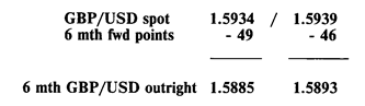 Например, валютному дилеру требуется прокотировать шестимесячный курс аутрайт фунта стерлингов к долларам США. Поскольку процентные ставки по фунту стерлингов выше, чем по долларам США, то фунт будет котироваться к доллару со скидкой. Дилер использует рейтеровскую страницу FWDW, где для периода в 6 месяцев (6М) находит следующую котировку 6-х месячных форвардных пунктов: 49/46. Текущий курс спот GBP/USD составляет 1.5934/39 (табл. 8). Поскольку форвардные пункты убывают слева направо, то они должны вычитаться из курса спот: