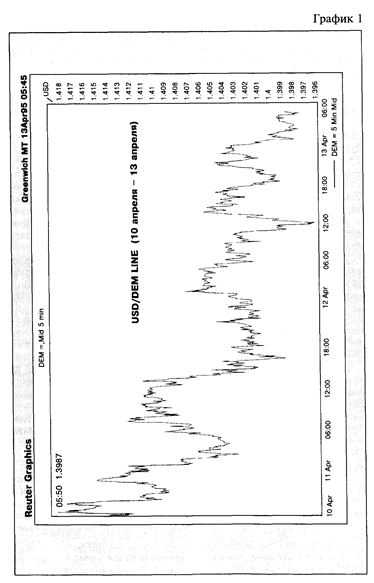 Значения курса, зафиксированные точками через определенные интервалы, соединяются прямой линией; в результате получается график движения курса. При этом горизонтальная ось служит для отражения времени (интервалов), на вертикальной оси откладываются значения валютного курса. На графике 1 приведен пример движения курса доллара к немецкой марке за двое суток на 11-13 апреля 1995 г. Обычно используется десять видов интервалов — «тик» (tick) то есть каждое новое значение курса, 1 мин., 2 мин., 5 мин., 10 мин., 1 час, 10 часов, сутки (24 часа), месяц, год.