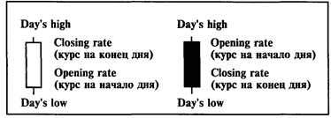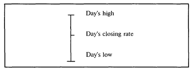 Для графика движения курса с суточными интервалами используются вертикальные отрезки, где верхняя точка — это наивысшее значение валютного курса в течение данных суток, нижняя точка — самое низкое значение курса за сутки,