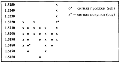 Колонка крестиков показывает повышение курса доллара, а колонка ноликов — его понижение. При этом, если в случае очередного движения курса вниз, он опустился ниже самого низкого значения (low) при предыдущем падении, то для дилера это является сигналом о продаже валюты (sell signal) в расчете на дальнейшее понижение курса. Если при очередном повышении курса он поднялся выше предыдущего наивысшего значения — это сигнал к покупке валюты (buy signal).