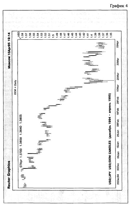 На графике 2 приведено движение курса доллара к японской иене за несколько месяцев (июль 1994 г.- апрель 1995 г.) с использованием дневных отрезков — баров.