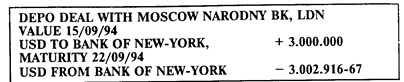 Это означает, что по данной сделке на дату валютирования 8 сентября 1994 г. мы платим 5 млн. долларов с нашего корсчета НОСТРО в Bank of New York, NY, и получаем 7.721 тыс. немемецких марок на корсчет НОСТРО в Ost-West Handelsbank, Frankfurt/Main.