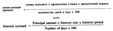 процент (interest) — цена использования заемных средств, то есть конкретная сумма приращения первоначальной суммы (принципала) на дату окончания депозита. В международной практике принято, что процент рассчитывается на дату возврата депозита (maturity), однако возможно также начисление процента ежемесячно (для периодов от 1 до 12 месяцев);