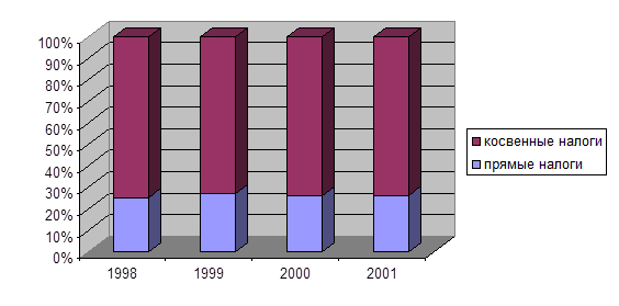 Из рис. 2.2.1 видно, что удельный вес прямых налогов в доходах государства с течением времени несколько изменялся, что обусловлено, во-первых, реформированием в налогообложении доходов как физических, так и юридических лиц, и, во-вторых, экономическими потрясениями, которые, воздействуя на благосостояние налогоплательщиков, эхом отражались на доходах государства. Косвенные же налоги стабильно держат и без того слишком высокую планку. Принимаемые меры по снижению налоговой нагрузки, включаемой в цену продукции, как-то снижение ставки чрезвычайного налога, не способствовали снижению уровня косвенного налогообложения. Не так то просто перестроиться на новую систему налогообложения, когда почти половина доходов государства образуется именно за счет внутренних налогов на товары и услуги, а других перспективных источников доходов на горизонте не предвидится.