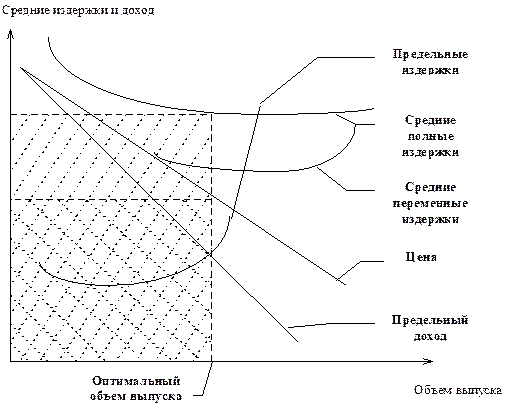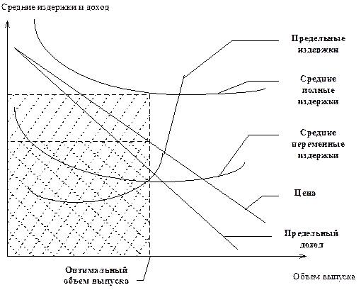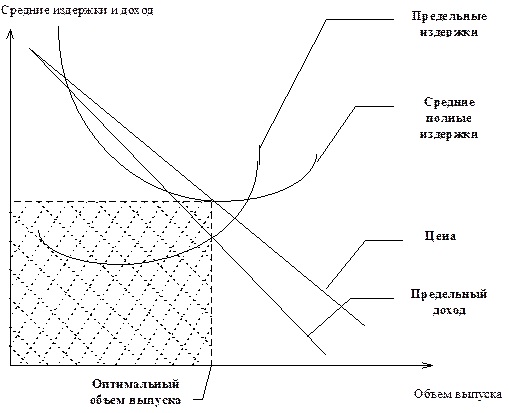 При такой структуре издержек и ценовой ситуации на рынке фирма не получает экономической прибыли, ибо ее полные издержки в точности равны совокупному доходу в точке оптимального объема производства.