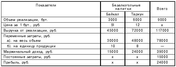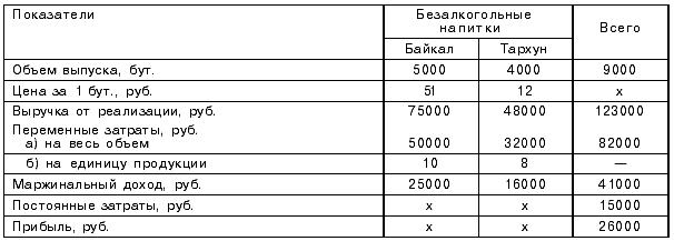 Как видно из приведенных данных, точка безубыточности (порог рентабельности) объема реализации будет 3375 бутылок, из них напитка «Байкал» — 1875 бут. и напитка «Тархун» — 1500 бут.