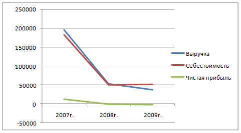 Выручка от продажи товаров, продукции, работ, услуг в 2009 году составила 36874 тыс. рублей, что на 30% меньше чем в 2008 году и на 80% меньше чем в 2007 году.