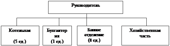 Предприятие имеет четыре структурных подразделения: котельная, банное отделение, бухгалтерия, и хозяйственная часть. Все они находятся в непосредственном подчинений у руководителя предприятия.