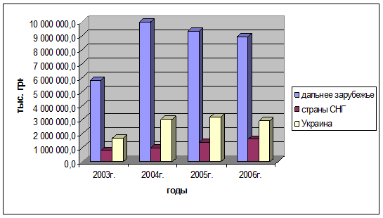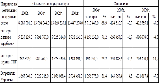 В течение 2006 года было реализовано продукции, работ, услуг на сумму 13 447 278 тыс. грн. Объем реализации товарной продукции в 2006г. по сравнению с 2005г. снизился на 422555 тыс. грн., вследствие снижения объема продаж листового проката на рынки дальнего зарубежья на 396678 тыс. грн., и объема реализации на внутреннем рынке – на 231617 тыс. грн. Объем экспорта в страны СНГ увеличился на 205740,4 тыс. грн. Снижение объемов реализации обусловлено ухудшением конъюнктуры мирового рынка черных металлов, и снижением спроса на металл на внутреннем рынке.