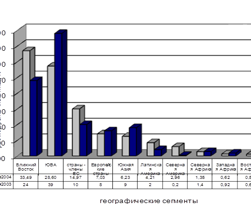 Рис. 3.3 – Динамика изменения размера рыночных ниш по географическим сегментам рынка за 2003-2004гг.