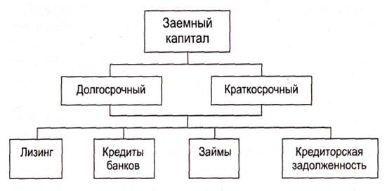 Заемный капитал (рис. 4.3) - это кредиты банков и финансовых компаний, займы, кредиторская задолженность, лизинг, коммерческие бумаги и др. Он разделяется на долгосрочный (более года) и краткосрочный (до года).