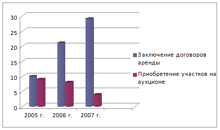 За период с 2005 по 2007 годы арендные отношения были заключены с нарастающим итогом. Динамика роста заключения договоров по сравнению с аукционами представлена на рис. 1.