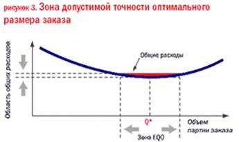 Формула Вильсона мало чувствительна к ошибкам в исходной информации или в прогнозе спроса из-за малой кривизны графика общих затрат в области ОРЗ. Учитывая состав формулы, при ошибке прогноза спроса на +20% изменение ОРЗ составит 1,2= = 1,095 или 9,5%. Если затраты на хранение рассчитаны с ошибкой -20%, то ошибка расчета ОРЗ составит 1/1-0,2 = 1,118 или 11,8%. Аналогично, если ошибка расчета затрат на хранение составляет +20%, то ошибка расчета ОРЗ составит 1/1+0,2 = 0,913