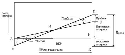 Из приведенных численных данных следует, что если компания продает 400 единиц товара, она получит нулевую прибыль (ни прибыли, ни убытков). Этот объем продаж и носит название “точки безубыточности” (break-even point).