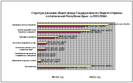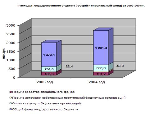 Расходы Государственного бюджета за 2004 год составили 2582,2млн.грн., в том числе по общему фонду - 1981,4 млн.грн. Расходы общего фонда Государственного бюджета за 2004 год на 608,3 млн.грн. или на 44,3% были больше, чем за 2003 год (приложение 15).