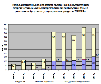 Расходы, проведенные за счет средств, выделенных из Государственного бюджета Украины на расселение и обустройство депортированных граждан за период с 1996 по 2004 год включительно составили 213,0 млн.грн., в том числе в 2004 году - 35,1 млн.грн. Годовые плановые показатели на 2004 год выполнены на 96,3% (приложение 17).
