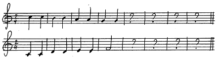 Звучат первые четыре такта. Поем с детьми их со словами «Наконец настали стужи». Ко второй фразе (На дворе замерзли лужи) дети должны досочинить мелодию самостоятельно.