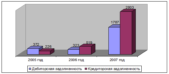 Рис. 9. Динамика дебиторской и кредиторской задолженности ООО «Рос-Таргет» в 2005-2007 годах, тыс. руб.