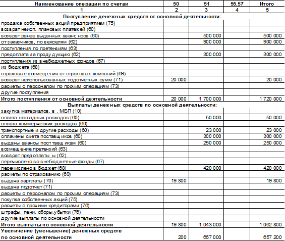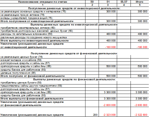 Анализируя данную таблицу модно сделать вывод, что денежные средства по сч. 50 увеличились на 200 руб., по сч. 51 сократились на 2323000 руб., а в целом сократились на 2322800 руб. По основной деятельности денежные средства выросли на 657200 руб., в том числе по сч. 50 – на 200 руб., а по сч. 51 – на 657000 руб.; по инвестиционной деятельности денежные средства сократились на 180000 руб., это сокращение произошло по сч. 51; по финансовой деятельности денежные средства сократились на 2800000 руб.