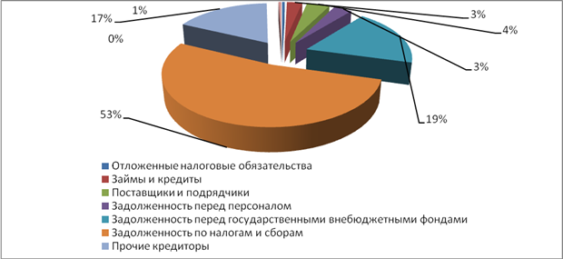 Как видно из таблицы 2.1 и рис. 2.1, большую часть заемного капитала в 2004 году составляет задолженность по налогам и сборам – 53%. Из оставшихся 47% 19% занимает задолженность перед государственными внебюджетными фондами и 17% - прочие кредиторы. Такая структура заемного капитала представляется крайне нерациональной, значительная задолженность по налогам и сбором и перед государственными внебюджетными фондами говорит о том, что предприятие вовремя не выполняет свои налоговые обязательства, а, следовательно, это может повлечь за собой начисление штрафов и пеней.