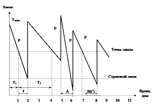 Нормируемыми величинами в этой системе являются величина заказа, размер запаса в момент размещения заказа (так называемая точка заказа) и величина страхового запаса. Заказ на поставку размещается при уменьшении наличного запаса до точки заказа. Как следует из чертежа, после размещения заказа запас продолжает уменьшаться, так как заказанный товар привозят не сразу, а через какой-то промежуток времени t. Величина запаса в точке заказа выбирается такой, чтобы в нормальной, рабочей ситуации за время t запас не опустился ниже страхового. Если же спрос непредвиденно увеличится (линия графика резко пойдет вниз - участок А графика), или же будет нарушен срок поставки (t¢ > t - участок В графика), то начнет работать страховой запас. Коммерческая служба предприятия в этом случае должна принять меры, обеспечивающие дополнительную поставку. Как видим, данная система контроля предусматривает защиту предприятия от образования дефицита.
