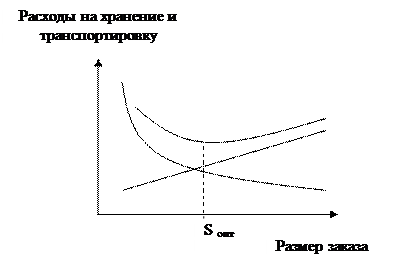 Сложив оба графика, получим кривую, отражающую характер зависимости совокупных издержек по транспортировке и хранению от размера заказываемой партии (рис. 9).
