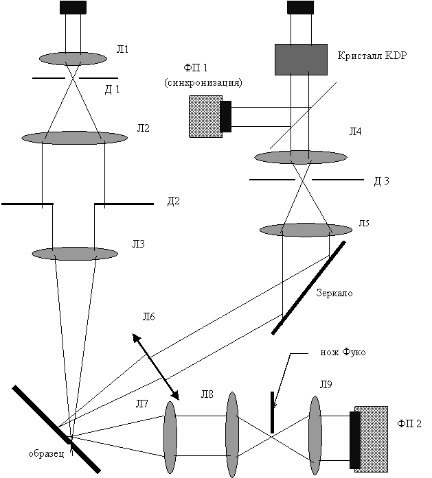 В данной работе для возбуждения и исследования ПАВ использовалась импульсная лазерная система, основные компоненты которой изображены на рисунке 4. Источником лазерных импульсов (которыми возбуждалась поверхностная волна) длительностью 20 наносекунд является твердотельный лазер на стекле с неодимом. Энергия одиночного импульса на выходе в одномодовом режиме генерации @ 10 мДж. В оптической схеме возможно осуществлять генерацию второй гармоники в нелинейном кристалле KDP. Таким образом в данной установке импульсное излучение лазера с длиной волны l=1.06 мкм ( hn=1.17 эВ ) легко может быть преобразовано в излучение второй ( l=0.53 мкм, hn=2.34 эВ ) гармоники. Телескопический расширитель луча составленный из линз Л4, Л5 и диафрагмы Д3 используется для формирования лазерного пучка накачки с определенными геометрическими параметрами, которые, при необходимости, можно варьировать. Цилиндрическая линза Л6 фокусирует световой луч в прямолинейную полоску длиной примерно 5 мм и шириной <50 мкм, поэтому фронт ПАВ приближенно можно считать плоским. Фотоприемник ФП1 используется для синхронизации акустического импульса с лазерным. Для регистрации ПАВ используется He-Ne лазер с длиной волны 0,632 мкм. Линзы Л1, Л2 а так же диафрагмы Д1, Д2 используются для получения пучка с гауссовым профилем. Линза Л3 фокусирует пробный луч на образец. Система регистрации отраженного луча состоит из линз Л7, Л8, Л9, ножа Фуко и фотоприемника ФП2. Нож Фуко используется как интерференционный прибор, позволяющий преобразовать малейшие изменения фазовых соотношений в отраженном луче в амплитудные, которые могут быть зарегистрированы фотодиодом.