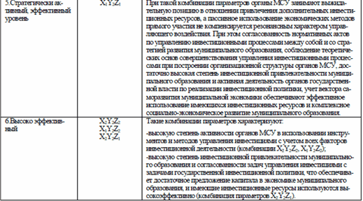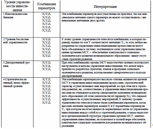 Таблица 1. Соответствие комбинаций параметров оценки уровня управляемости инвестиционными процессами со стороны органов МСУ уровням управляемости