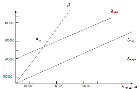 Вкр = Зпост / ( Ц – Зпер) = 200000/ (4,5–3,2) =153856 шт.