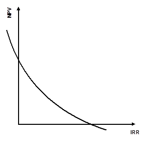 Для построения графика данной функции на оси абсцисс будем откладывать значения ставки дисконтирования, а на оси ординат – чистую приведенную стоимость инвестиций. Чистая приведенная стоимость инвестиций изображается для всех ставок дисконтирования от нуля до какого-нибудь разумного большого значения. Для ординарного денежного потока данная функция является монотонно убывающей, и ее график имеет следующий вид (рис. 1).