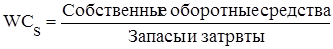 Доля собственных оборотных средств в покрытии запасов. Характеризует ту часть стоимости запасов, которая покрывается собственными оборотными средствами, и рассчитывается следующим образом: