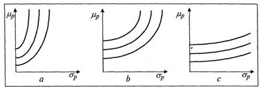 Рис. 3. Кривые безразличия инвесторов, различающихся склонностью к риску: а - невысокая склонность; b - средняя склонность; с - высокая склонность