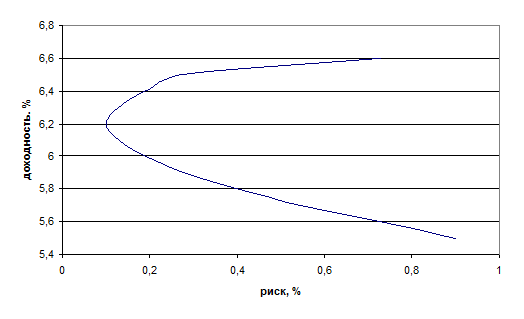 8. По предложенной методике был проведен расчет различных структур портфеля в зависимости от величины доходности, которая колебалась в диапазоне от 5,5% до 6,6%. Дальнейший выбор осуществляет инвестор в зависимости от приемлемого для него уровня риска.