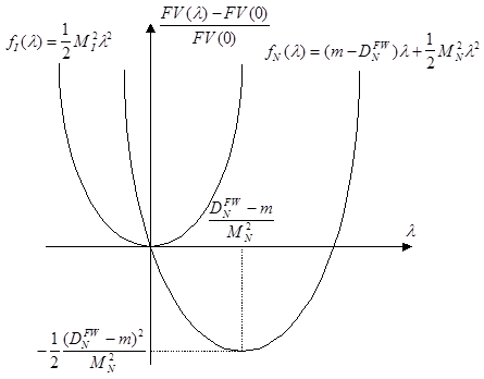 Регулируя структуру портфеля, инвестор не может изменить ожидаемую доходность вложений s(m) и ожидаемую стоимость портфеля через период m FV(0). Но, как показывает уравнение (1.2.33), полученное автором, инвестор может изменить зависимость доходности вложений от размера сдвига форвардных ставок l, или скорректировать профиль риска портфеля, управляя значениями показателей DFW и М2.