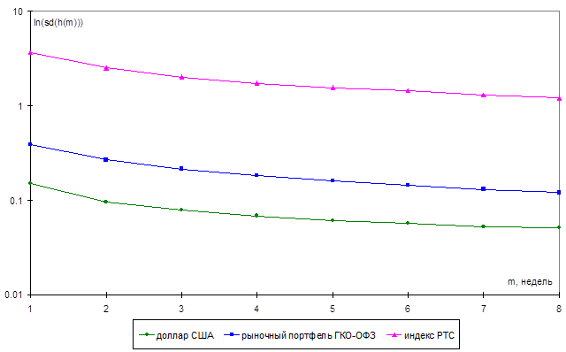 В качестве представителей других сегментов финансового рынка нами рассматривались обменный курс доллара США к российскому рублю, а также индекс Российской торговой системы (РТС). Среднеквадратические отклонения доходностей вложений в доллар США и индекс РТС для сроков от 1 до 8 недель были рассчитаны на основе исторических выборок за период с 31.09.2000 по 28.03.2001.