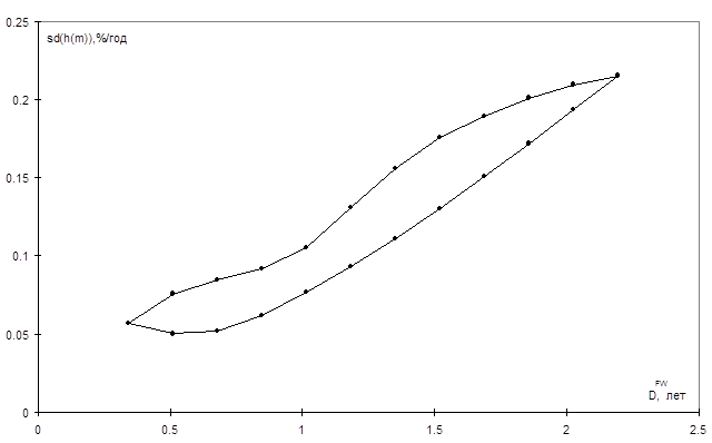 Как свидетельствует рис.2.3.4, уровень риска, связанного с размещением средств на рынке ГКО–ОФЗ, существенно меньше (примерно в 9.7 раза) уровня риска операций на рынке акций, но больше (примерно в 2.6 раза) уровня риска операций на валютном рынке. На всех сегментах финансового рынка наблюдается обратная зависимость между сроком вложений и среднеквадратическим отклонением рыночной доходности. Следовательно, уменьшение уровня риска портфеля государственных облигаций при увеличении срока вложений не следует связывать с сокращением разрыва между дюрацией и сроком вложений. Гораздо сильнее проявляется другой эффект, общий для всех сегментов финансового рынка и обусловленный удлинением периода начисления процентов и увеличением знаменателя формулы расчета доходности.