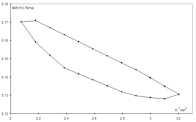 Рис.2.3.6. Диапазон возможных соотношений между значением показателя M2 и среднеквадратическим отклонением доходности портфеля с дюрацией 1.5 г. для срока вложений 8 недель по состоянию на 28.03.2001.