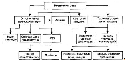 Так, при оптовых ценах франко-станция отправления все расходы по доставке до станции отправления включены в оптовую цену, а все последующие транспортные расходы несет покупатель. Цены франко-станция отправления ранее имели наибольшее распространение в материалоемких отраслях промышленности, а цены франко-станция назначения — в отраслях, обслуживаемых централизованной системой сбыта массовой продукции, затраты па перевозку которой составляли значительный, удельный вес в себестоимости. Однако экономическая целесообразность франкировки оптовых цен в условиях развития предпринимательства должна определяться не формами снабжения и сбыта, а влиянием на коммерческую деятельность предприятия взаимовыгодных отношений между производителем и потребителем продукции. Розничная цена включает оптовую цену промышленности и торговую накидку (скидку). Если оптовые цены применяются преимущественно во внутрихозяйственном обороте, то по розничным ценам товары реализуются конечному потребителю — населению. Структура розничной цены представлена на рисунке: