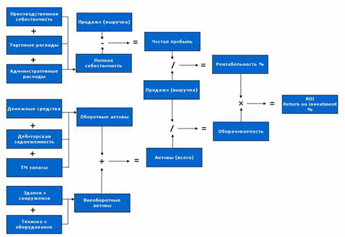Коэффициент ROI рассчитывается как произведение рентабельности продаж на оборачиваемость активов. Каждый из этих двух показателей в свою очередь раскладывается на группы факторов, совместное действие которых влияет на конкретные значения показателей.
