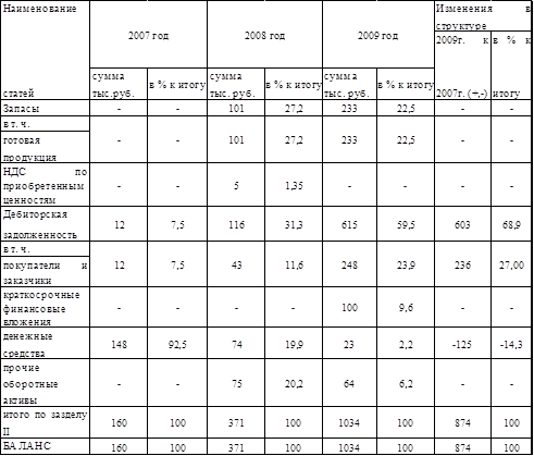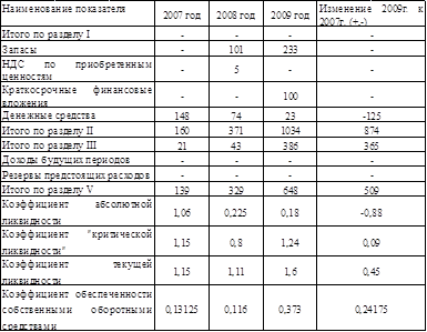 В 2009 году возросла дебиторская задолженность предприятия по сравнению с 2007 годом на 603 тыс. руб. или на 68,9%. Начиная с 2007 года отмечается значительное снижение денежных средств. По отношению к 2007 году в 2009 году количество денежных средств снизилось с 148 тыс. руб. до 23 тыс. руб. что в процентном отношении равно 14,3%.