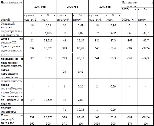 В пассиве мы наблюдаем значительное увеличение доли нераспределенной прибыли, которая в 2007 году составляла всего 11 тыс. руб., а в 2009 году – 376 тыс. руб.