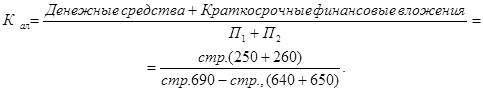 Традиционно расчеты начинают с определения коэффициента абсолютной ликвидности, который рассчитывается как отношение наиболее ликвидных активов к сумме наиболее срочных обязательств и краткосрочных пассивов